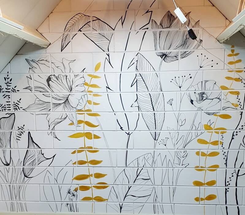 Een witte muur in mijn eigen atelier (zoldergarage) kan natuurlijk niet. Met stiften en goudverf had ik in een mum van tijd een bos met bloemen!
