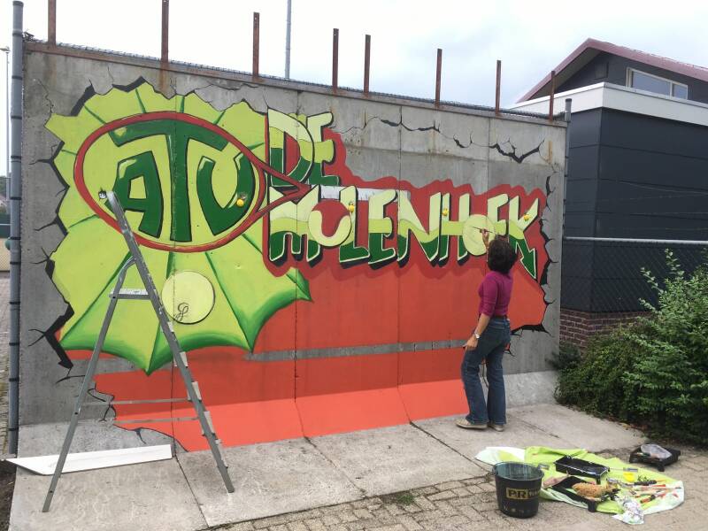 Voor de Aadorpse tennisvereniging kreeg ik in 2017 de vraag of ik de betonnen muur van 5 x 2,5 meter kon verfraaien met een opvallende muurschildering. Ik heb hierin het logo verwerkt met de kleuren van het gras, de baan en tennisballen. Als je over de Aadorpsweg rijdt is het goed te zien.